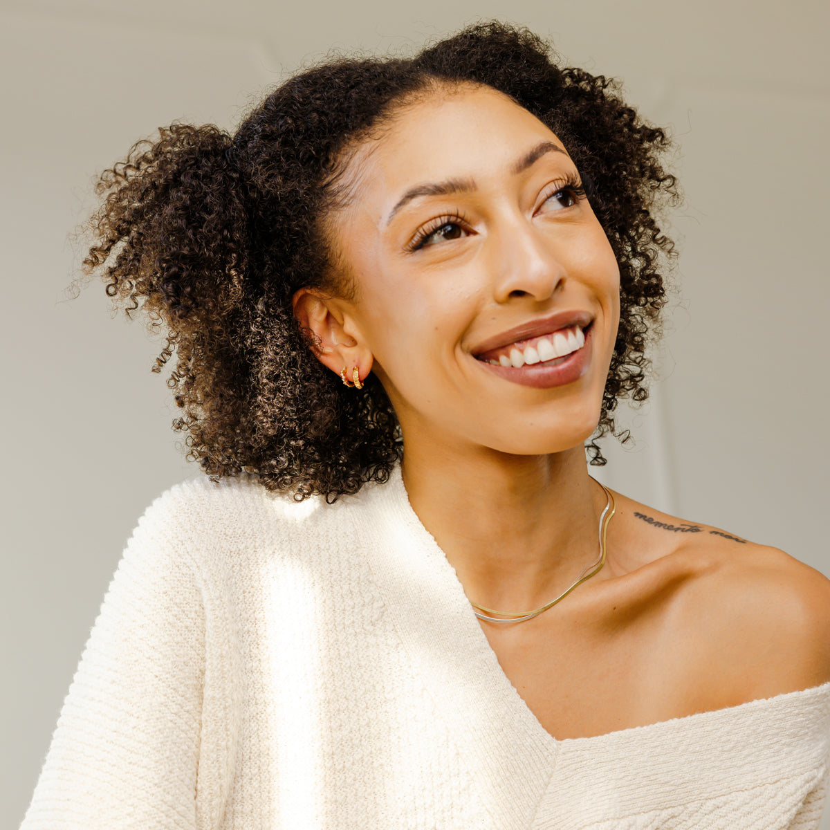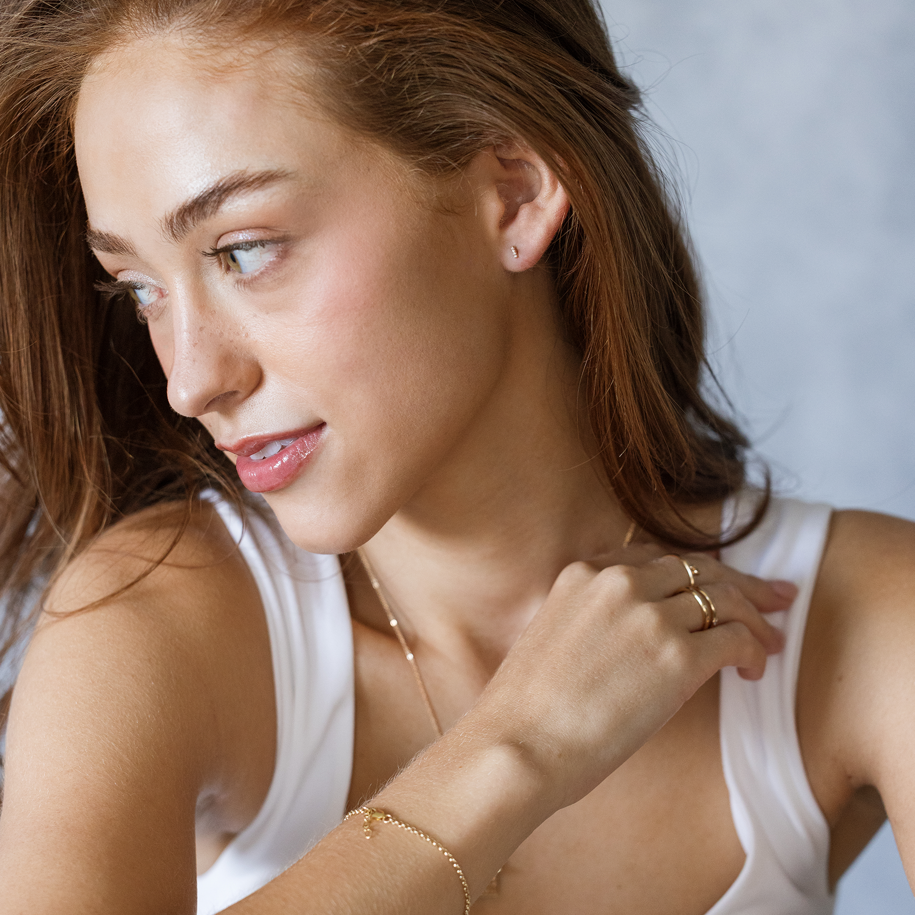 As the 14K gold necklace rests on your collarbone, what you feel first is not weight, but warmth. It quickly adopts your body's temperature, as if it were always a part of you. The meticulously polished curve is smooth like a pebble, tracing an imperceptibly gentle path against your skin with every breath and movement. It makes you constantly aware of its presence, yet never feeling its burden.